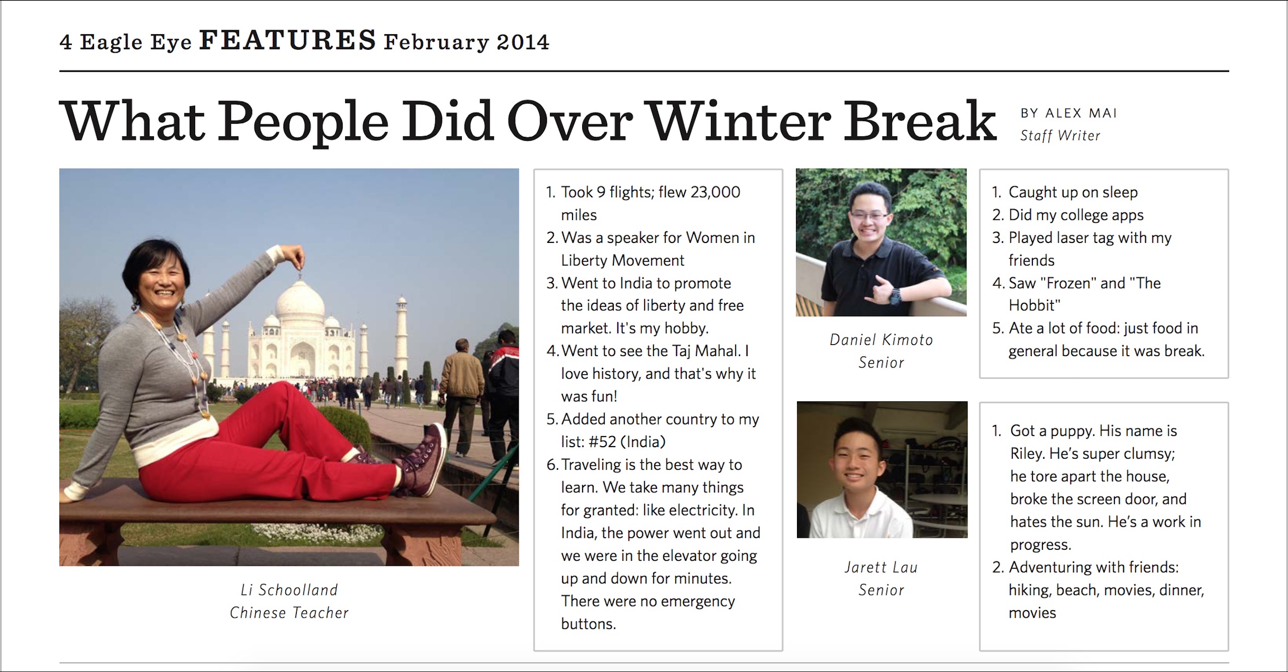 These are some of the articles that I have written for Hawaii Baptist Academy's Eagle Eye newspaper. Having minimal experience in Adobe products, except for Adobe Photoshop, I quickly adapted to both Adobe Bridge for image consolidation and Adobe Indesign for styling the newspaper due for print. Writing for the newspaper has allowed me to gain new perspectives and to better understand the people whom I interviewed. Click here to read about our Midweek awards.